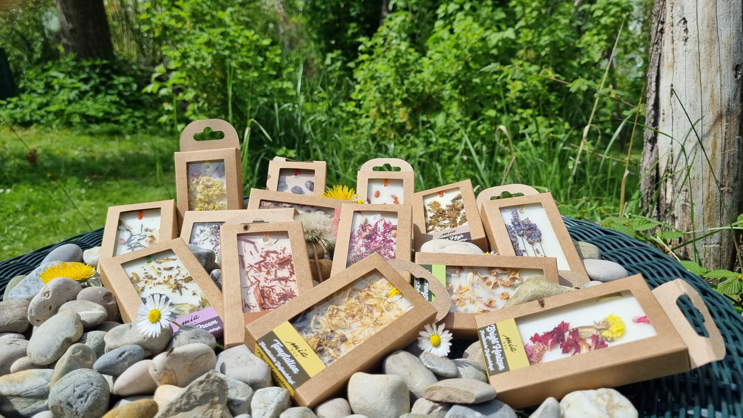 Natürliche ätherische Öle, Sojawachs, Sheabutter, Blumen und Kräuter.